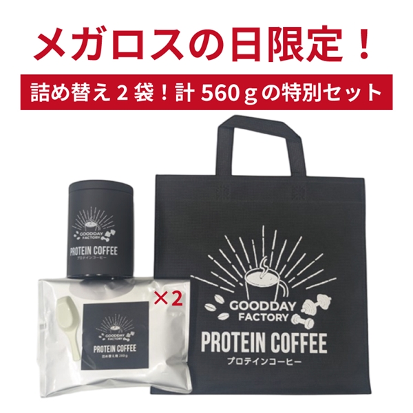 特別セット内容・キャニスター缶・メガロスプロテインコーヒー詰め替え用(280g)・ロゴ入りショッパー・計量スプーン※キャニスター缶の中に粉は入っていません