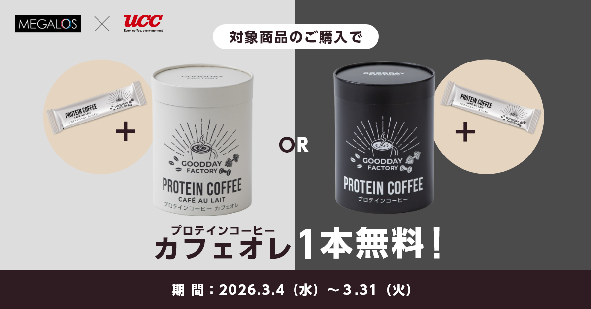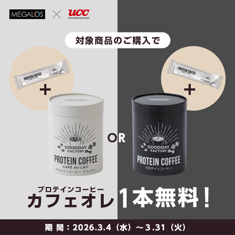 当サイトからプロテインコーヒーまたはプロテインコーヒーカフェオレをご購入いただくと、プロテインコーヒーカフェオレ1包を同梱してお送りいたします。